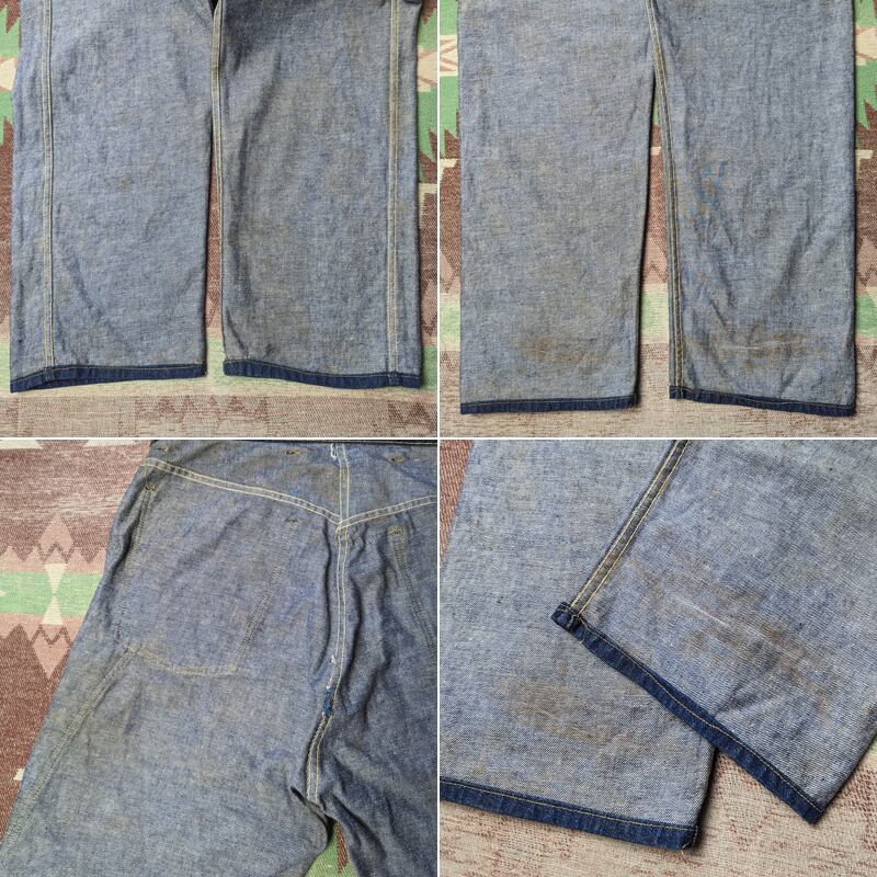 ヒップポケットのVステッチ抜け、左前ポケットのリベット際に手縫いリペア、タグほつれ、裾にロールアップ痕の擦れがわずかに見られる程度で大きなダメージはありません。