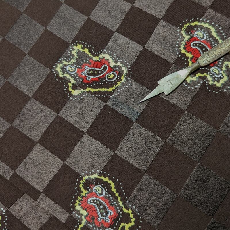 ダークブラウンベースにペイズリー調の柄プリント、チェッカーパターン織り。