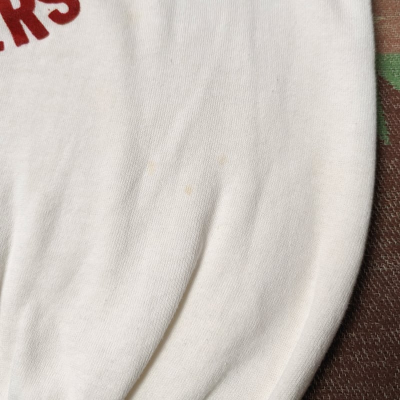 ワンウォッシュ、使用感の少ない良好なコンディションです。右肩にプリントの際についたと思われる赤いシミ、ところどころ薄い茶色シミが見られます。茶色シミに関しては部分的な染み抜き等でもっと薄くすることも可能と思われます。