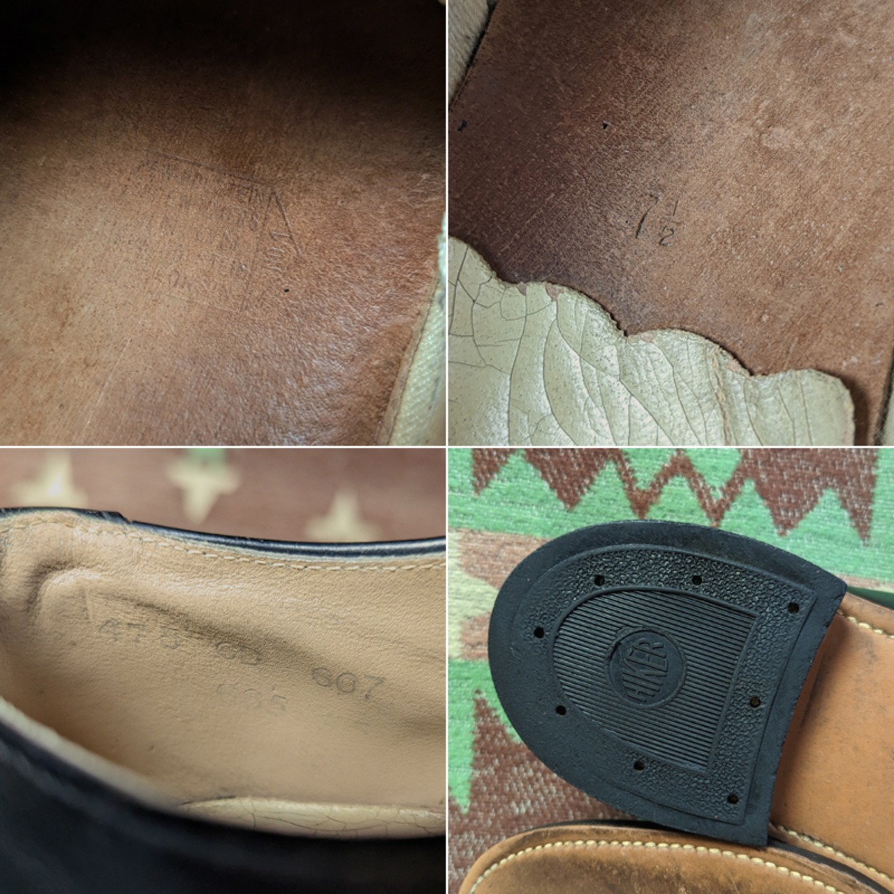 履き口に若干の亀裂が見られ、一番大きなもので5mm程の破れ(表革のみ)があります。そのほかアッパーレザーに擦れ・剥げ・シワ、インソックにヒビ、フットベッドにシミ、など見られますが、特別ひどいものはないと思います。アウトソールを見ると全体的な使用感は少ないです。