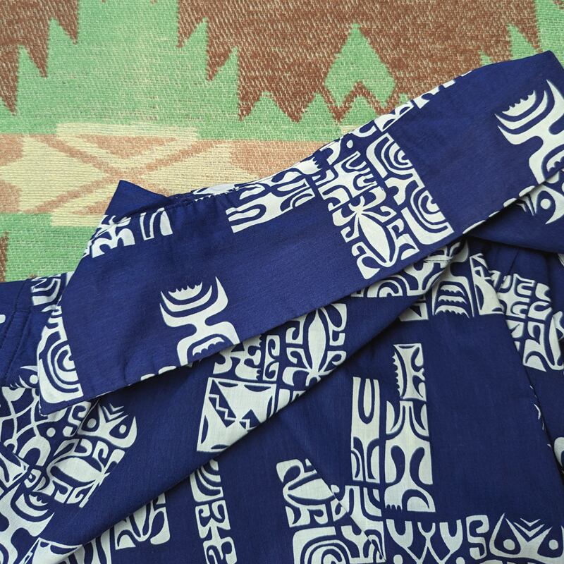 ネイビー×ホワイトのツートーン、コットン生地。TIKIモチーフ、柄の配置に特徴があり、ありそうでないパターンと思います。
