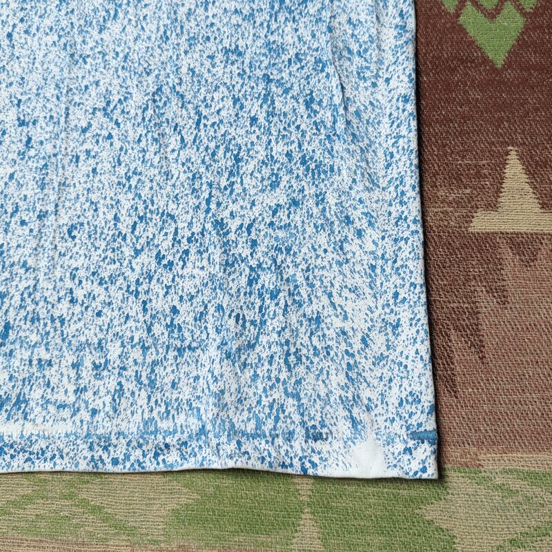 塗料(ライトブルー)を飛ばしたようなスプラッターパターンのプリント。一枚でもインナーでも楽しめる、柄物Tシャツです。