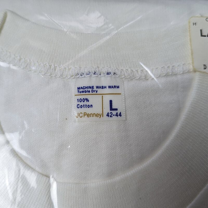 ※未開封のためシミ汚れやヤケなど確認することができません。見える範囲では首リブ左にシミ汚れあり。白は洗濯・漂白によりきれいになりますので問題ないとは思いますが、数十年を経過したアメリカ製・デッドストックをご理解いただける方のみご検討ください。