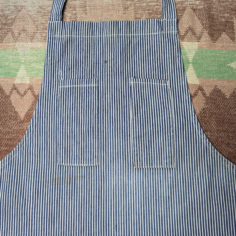 丈を詰めて、その生地を使用して右胸と左下のポケットを追加したものと思われます。首と腰のストラップはやや短くなっています。ウエスト周りは約95cmですので、もっと余裕がほしい方は生地を足すなど手を加える必要があります。