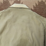 全体的にシミ汚れが多く見られ、右胸や背中は特に目に付きやすいように思います。※洗濯済みですので概ねクリーンな状態です。袖などにいくつかダメージやリペア、襟・袖口・裾に擦れ、袖ボタン左右各1つ欠損、ゲームポケット内側のコーティングはほぼなくなっています。