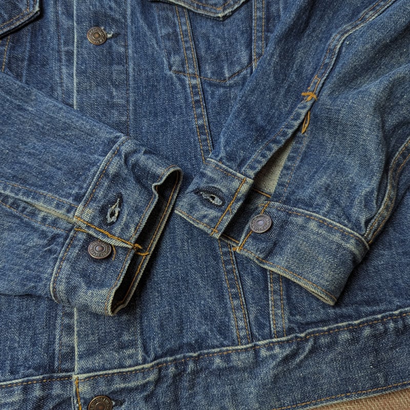 袖を中心に自然な擦れ色落ち・薄いシミ汚れ程度は見られますが、ノーダメージで良好なコンディションです。