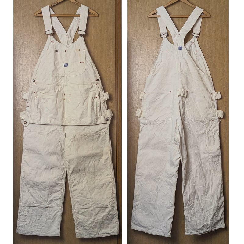 脚部分の正面・サイドにぼんやり茶色味帯びたシミ、他にもビブポケット左上や裾周辺など、全体的にところどころシミ汚れは見られますが、特別ひどいものはなくアジと捉えられるものと思います。白系のワークウェアに関してはこれくらいの雰囲気の方がこなれていて好まれる方も多いと思います。