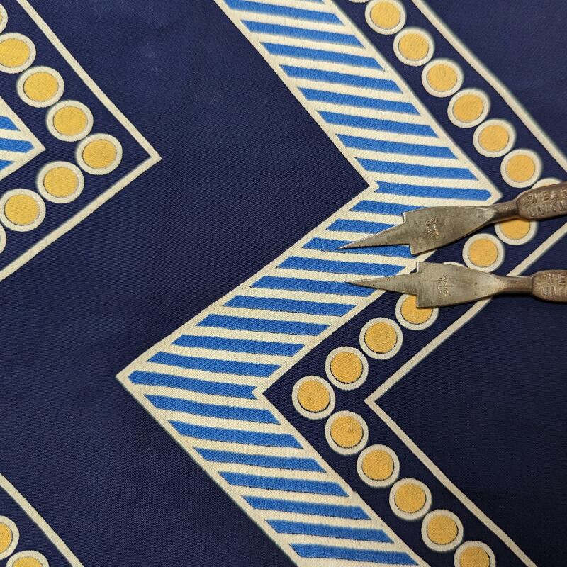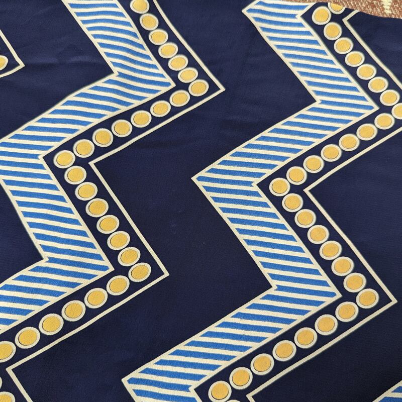 ダークネイビーベース、水玉ドットやストライプによるジグザグパターンのプリント柄。