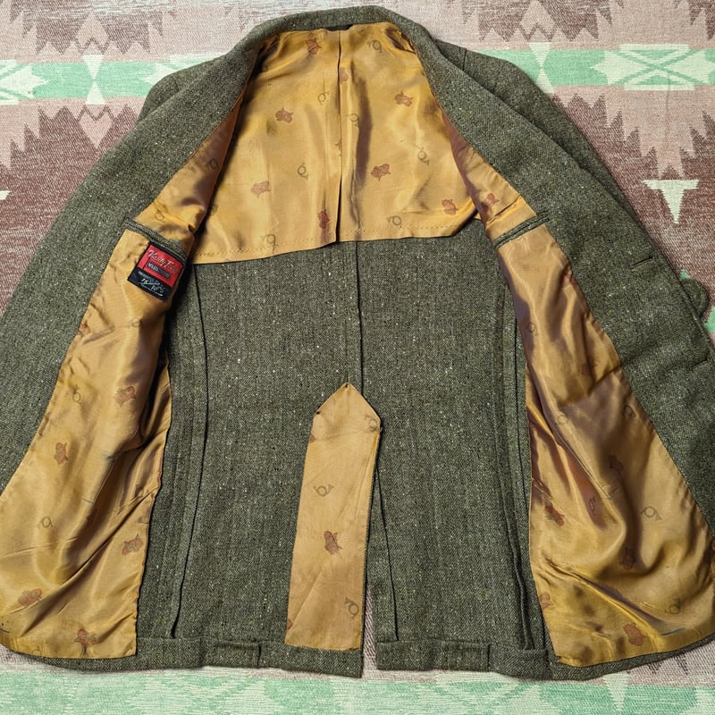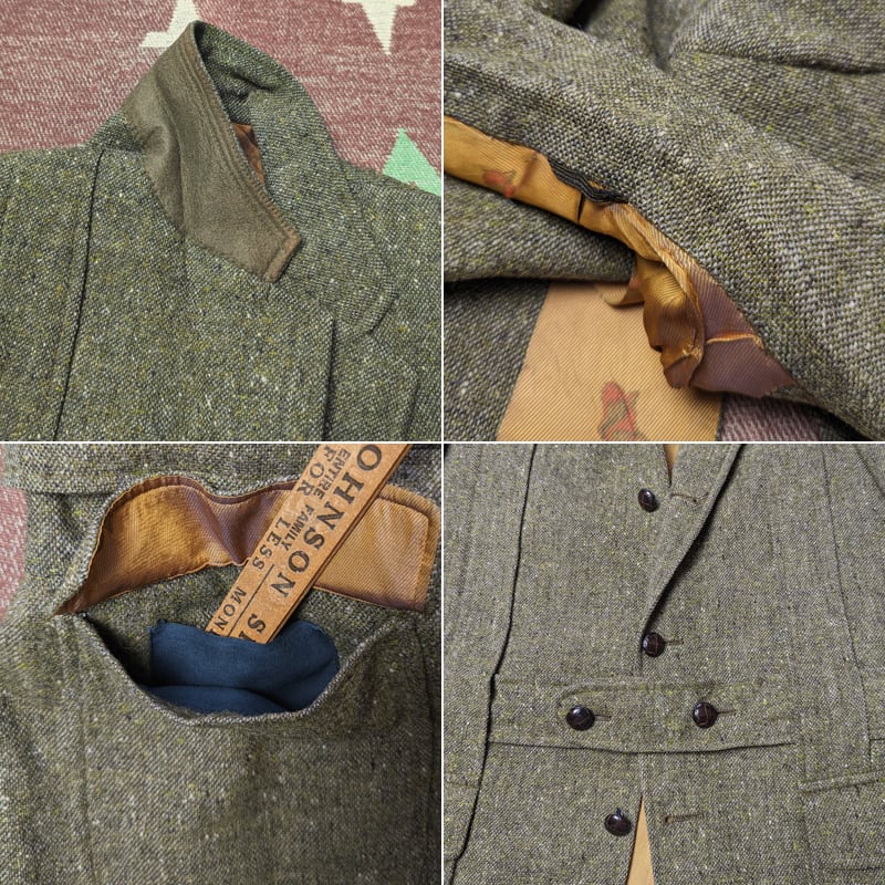 左袖ボタン1つ欠損、襟や肘にわずかな擦れ程度は見られますが、大きなダメージはなく良い状態です。裏地は若干の擦れや黒ずみシミ汚れがあり、アームホールに少し縫製から外れた部分がありますが、このままでも問題ないと思いますし補修も容易かと思います。