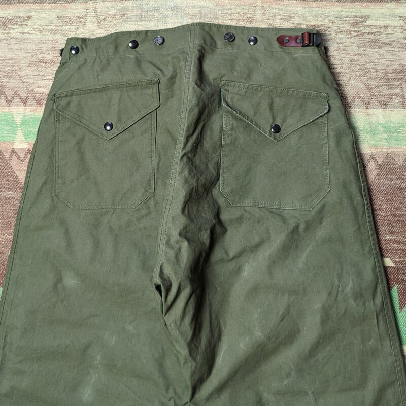 ウエストアジャスターは位置を変えて打ち直されていてレザーは切れてなくなっています。ところどころ白っぽいくすみ・擦れが見られますが、このての生地ではある程度は仕方ない点かと思います。穿き込んでいくとより気にならなくなっていくものと思います。