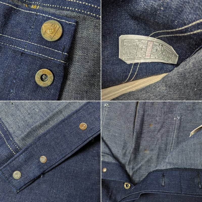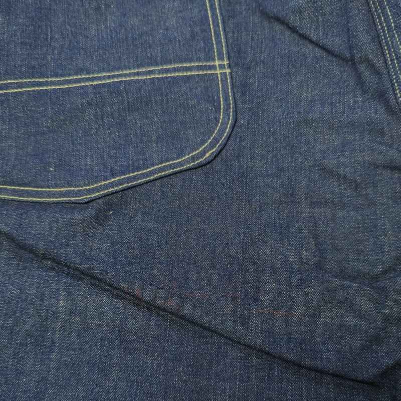 デッドストック。フラッシャー欠損、ボタンに錆び、左ヒップポケット上に織りむら玉、ヒップ下に小さなキズ、左ヒップ下にサイズを書き込んだ赤い文字(現状デニムが濃いこともありさほど目立ちません)があります。