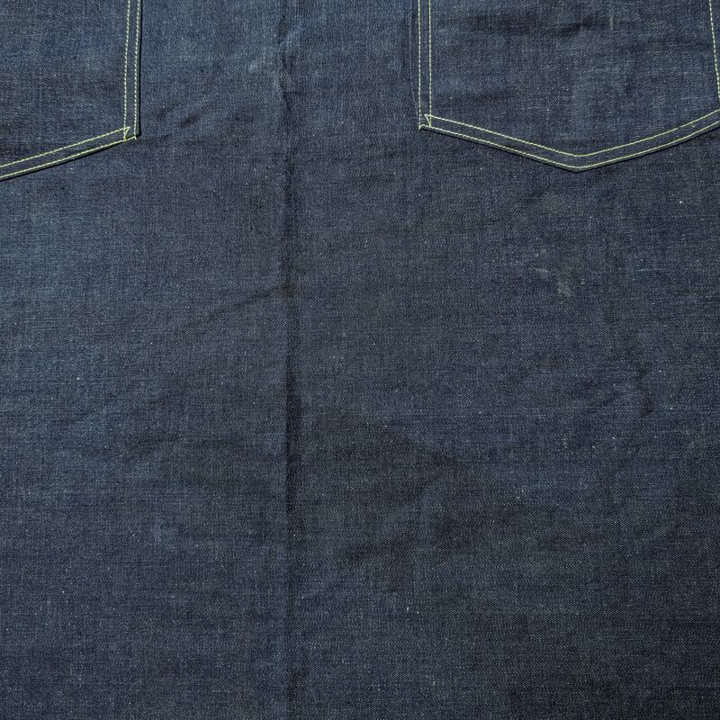 USEDですが、水通しなしのパリっとした生地感です。胸~お腹~太ももなどにくすみ汚れ、中央少し下にぼんやり黒っぽいやや大きなシミ汚れがあります。洗えば落ちるものか判断できませんが、現状デニムの色が濃いためさほど目立たないものです。特にダメージはなく問題なくお使いいただける良好なコンディションです。