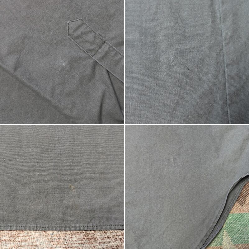 左肩の茶色シミに穴があります。そのほか、裾周辺や袖などに若干の擦れや汚れは見られますが、使用感は少なく、しっかりとコシがある生地感です。