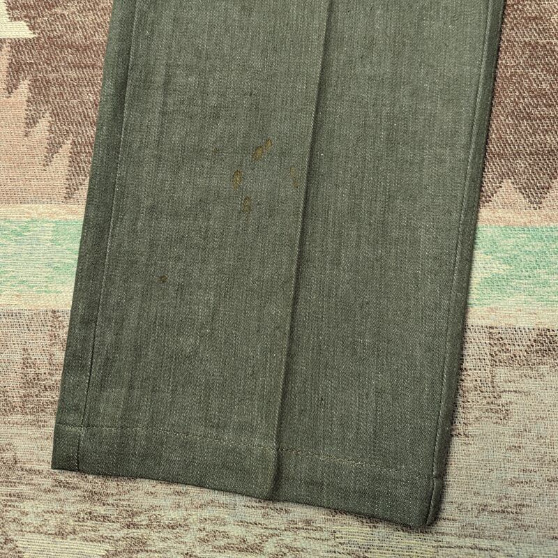 ほんの少し着用されているかもしれませんが、デッドストックでも通用する水に通っていない良い状態です。裾近くを中心に若干のシミ汚れや元々の織りむら程度は見られますが、ダメージや目立つヤケ等なく、特に問題のない良好なコンディションです。