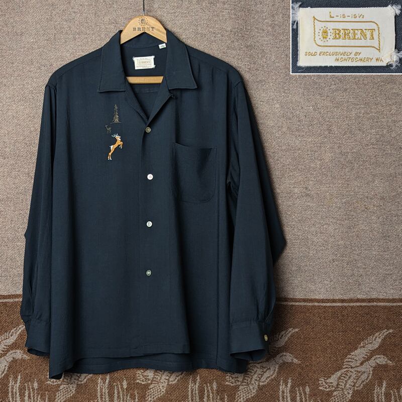 60s BRENT Deer Embroidered Rayon Box Shirt (L) BLACK