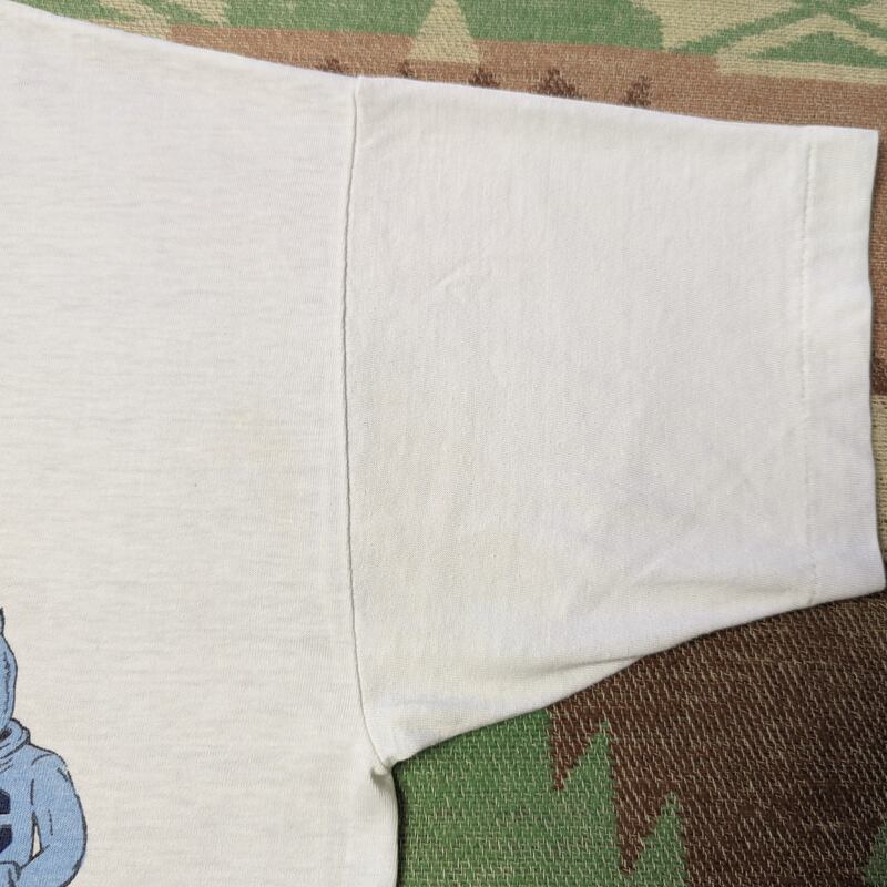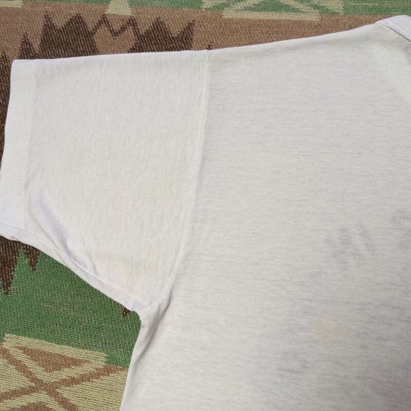 前左右にシミ汚れ・脇染み・右肩シーム補修があり、やや薄手のテロっとした生地感です。問題なく着こなせるヴィンテージ古着慣れされた方は多くいらっしゃる程度かと思います。コレクションとしてであればコンディションに関しては特に問題ないと思います。