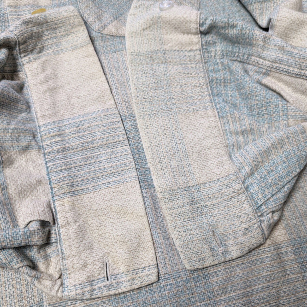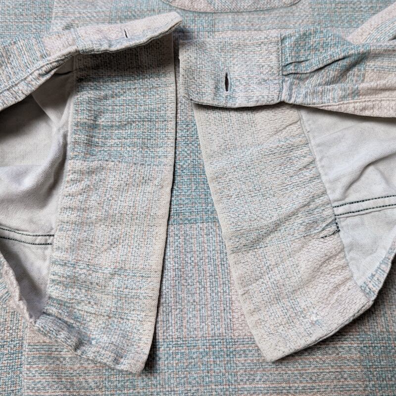 襟やカフスにくすみ汚れやプリント薄れが見られます。袖口が若干擦り切れ始めてはいるものの、現状大きなダメージにはなっていません。トップボタンとループの付け根にリペアがあり、カフスボタンは交換されています。