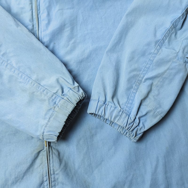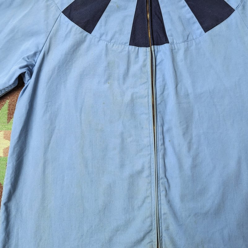 ご覧のとおり、ほぼ全体的に黄ばみ・シミ汚れが見られます(※洗濯済み)。大きな破れ等のダメージはありませんので、シミ汚れを気にせず着られる古着慣れされた方には良い一枚と思います。