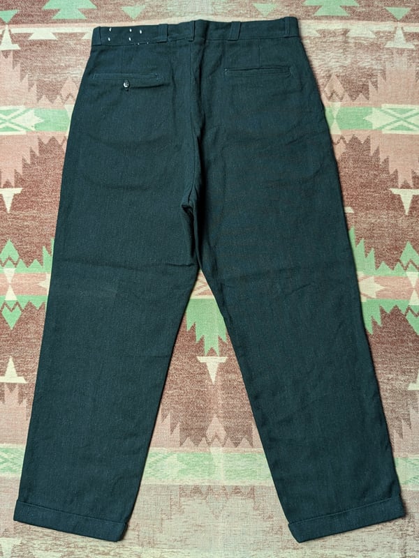 暗めのフォレストグリーンに少し白い糸が混ざった厚手の生地(オールコットン)。個人的にはこれまでも区別してきましたが、ウィップコードと呼称されることも多い生地です。