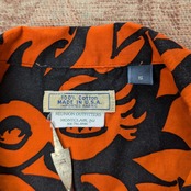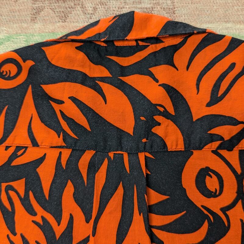 開襟のBOX型(ループシャツのように襟付け根にボタンやボタンホールはありません)、バックヨークにBOXプリーツ、ポケット柄合わせ。