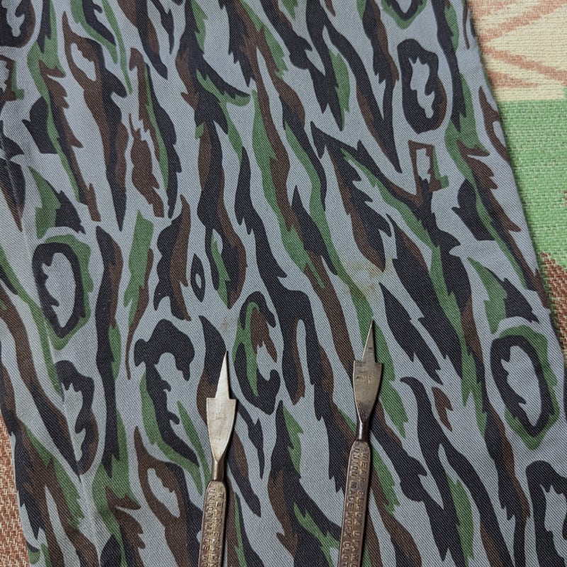 特徴的なフレイムカモパターン、やや薄手でさらっとしたポリコットンの軽快な生地感です。