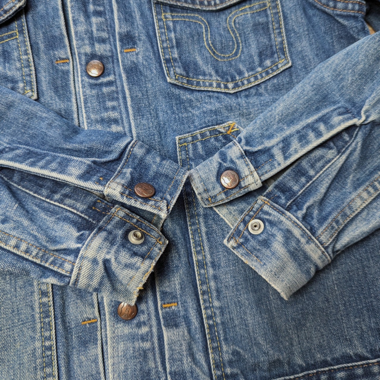 袖口に擦り切れがある程度で大きなダメージはありません。襟も色落ちはしていますが生地ダメージはないです。左袖に元々の織りむらネップ玉、着用による自然な色落ち・擦れ・アタリ・多少のシミ汚れは見られますが、特に大きな問題点のないコンディションです。