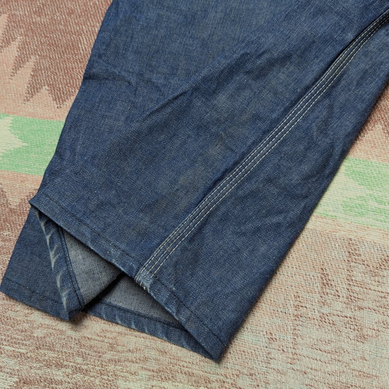 未洗いUSED状態から軽くワンウォッシュしてさっぱりとした状態です。脚部分を中心に汚れが残った箇所はありますが、もっとしっかり洗濯して汚れを落とすか、デニムの色残りを重視するか、各々判断が分かれるかと思います。股ボタン横にわずかな色落ち箇所・裾に若干の擦れはありますが、ダメージは特にありません。